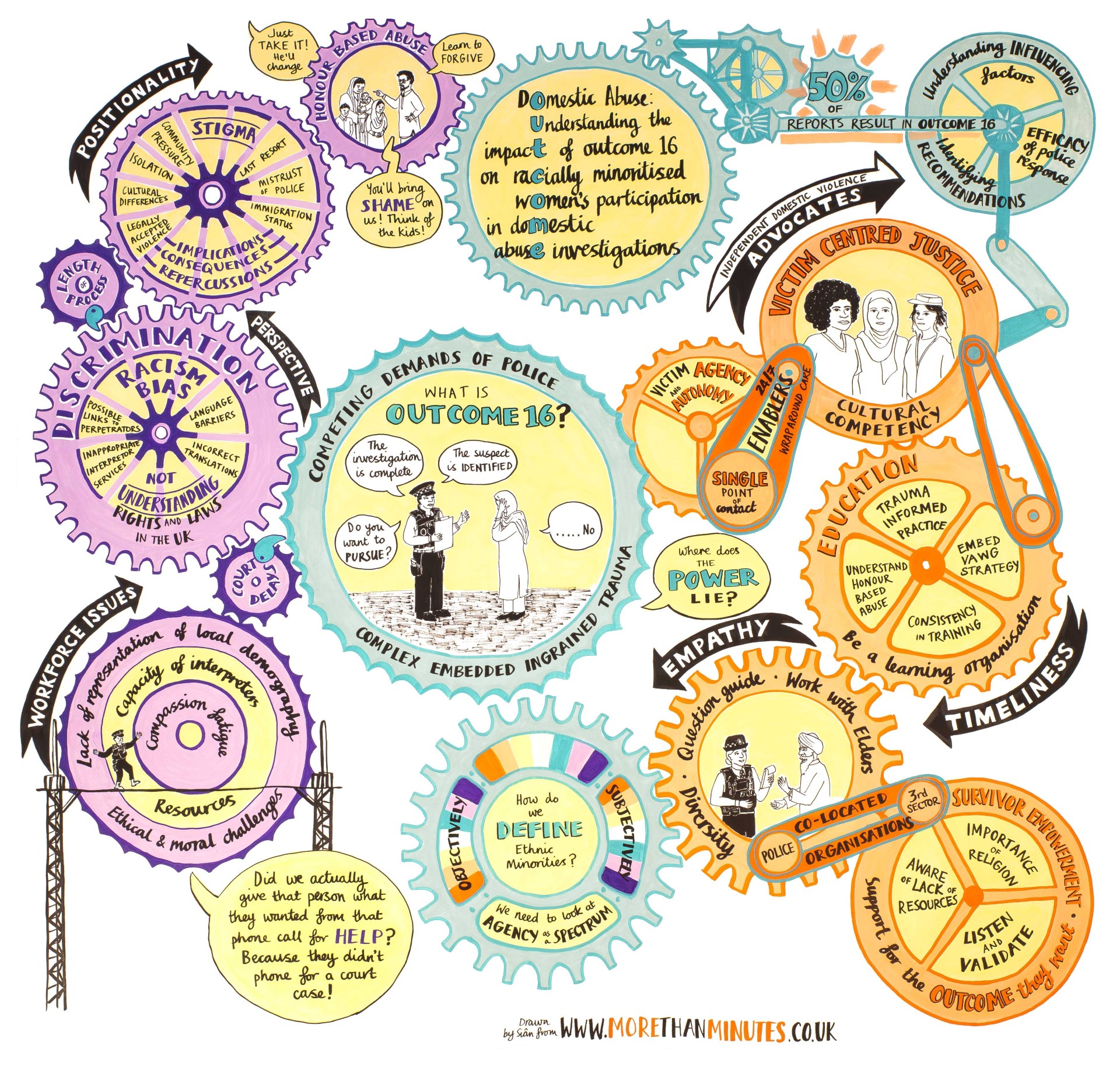 In cases of Domestic Violence and Abuse (DVA) it is common for survivors to withdraw support for police action; this can be for a complex matrix of reasons (1-7). The police use outcome 16 to describe the finalisation of an investigation where the suspect was identified, but the victim did not support police action (8). On average 51.4% of domestic abuse cases were discontinued in England and Wales year ending 2022 (8). This research was developed to support police forces to improve their understanding of why over half of cases are finalised in Outcome 16 and inform a better response to survivors and support prosecution. Currently there is a dearth of research which explores victim engagement and racial disparity, and this was identified as a priority area to be examined.